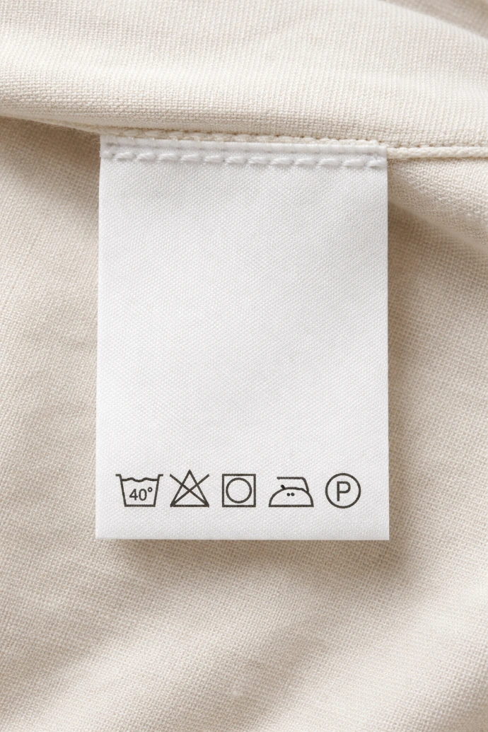 This is the information label that shows how to wash, dry, and iron the product, usually located on the side seam.